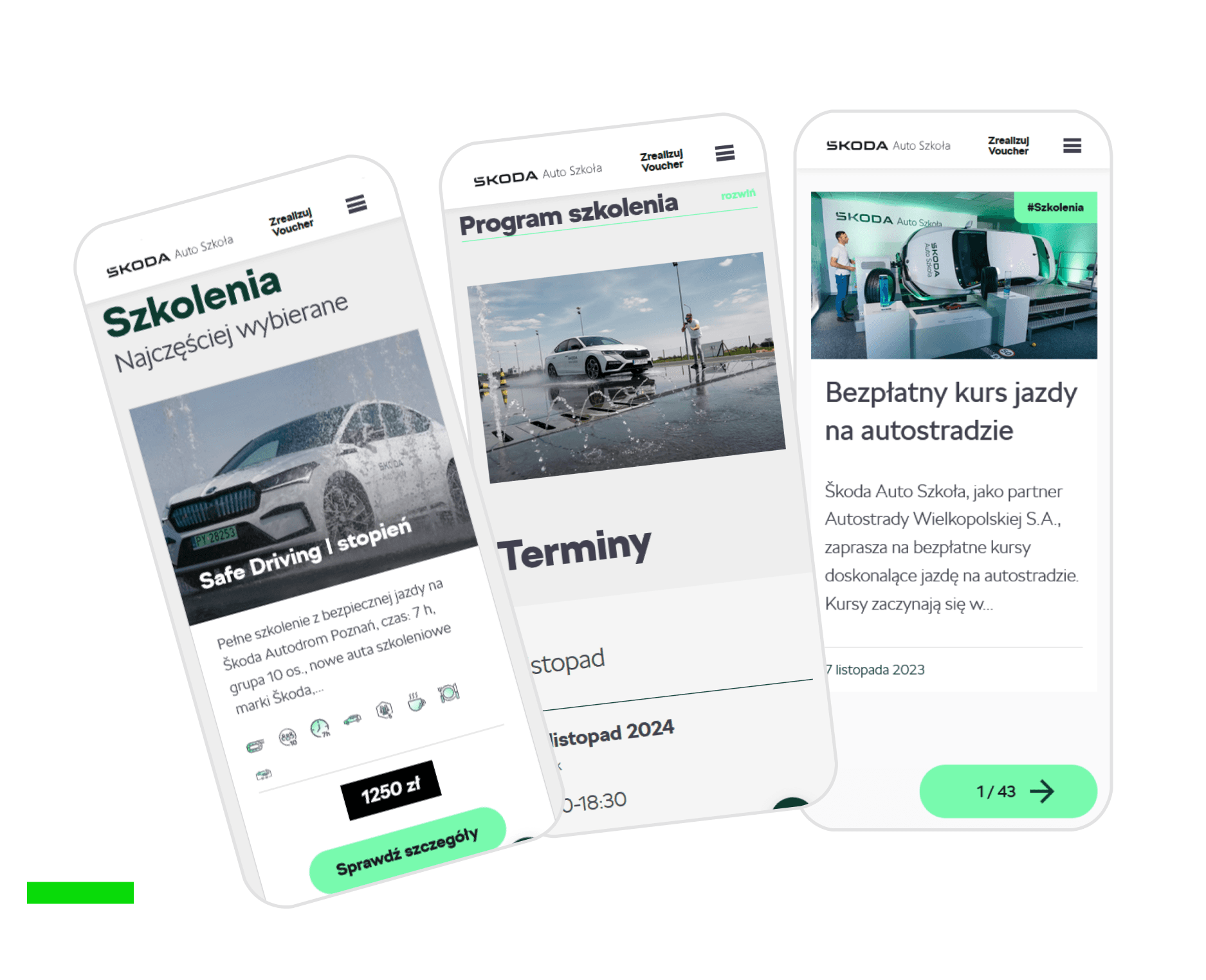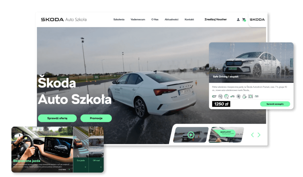 W ramach projektu dla szkoły nauki jazdy Skoda Auto Szkoła, której misją jest poprawa bezpieczeństwa na drodze, opracowaliśmy nowoczesny serwis internetowy do rezerwacji zaawansowanych kursów jazdy w trudnych warunkach. Strona została zaprojektowana z myślą o prostocie i efektywności, umożliwiając użytkownikom szybkie i łatwe zapisanie się na kursy, które są kluczowe dla kształtowania świadomych i odpowiedzialnych kierowców.